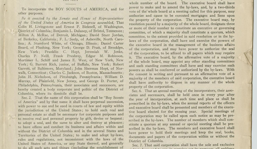The “Act to Incorporate the Boy Scouts of America and for Other Purposes” granted a federal charter to the Boy Scouts of America (BSA), officially recognizing the organization as a nationally chartered nonprofit with a mission to build character, citizenship, and practical skills in the nation’s young men. This act of Congress placed the BSA among a select group of patriotic and educational organizations, giving it a special status that affirmed its unique role in shaping generations of American youth.